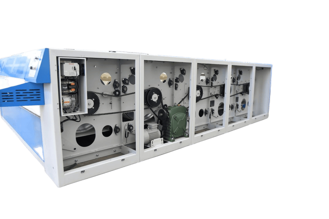 2. 传动结构..采用弹性张紧装置。前后辊差速控制..,避免拉损布草又兼顾拉紧质量,运行平稳噪音低。